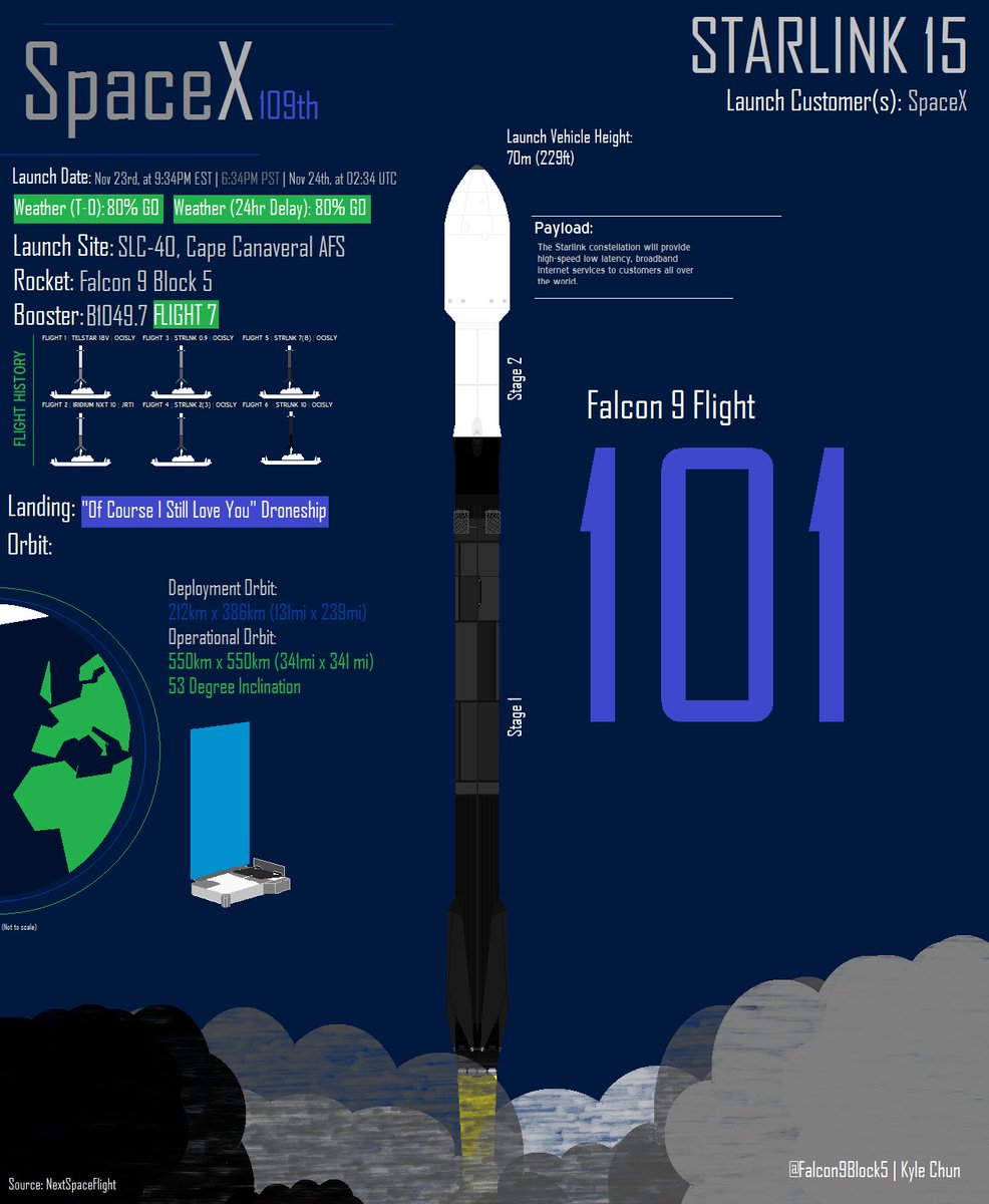 #SpaceX is targeting a new T-0 of Nov 23rd, at 9:34PM EST | 6:34PM PST | Nov 24th, at 02:34 UTC, for the next launch attempt of the 15th #Starlink mission from SLC-40. As of the latest weather filing, weather should be 80% favorable for launch. #Falcon9pic.twitter.com/Vvh6KEScxA