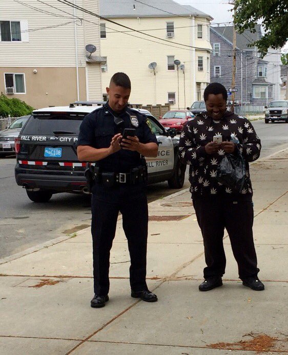 @FeitsBarstool picture of a guy in a weed jacket and a cop playing Pokemon! What a time to be alive!!!! -