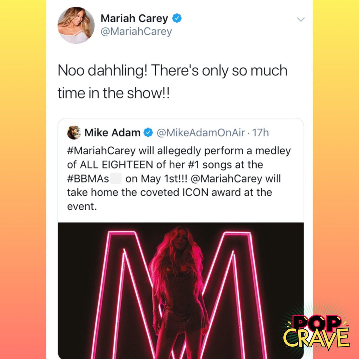 @MariahCarey playfully confirms that she will not be performing a medley of all 18 of her #1 singles at the BBMA’s due to time constraints.pic.twitter.com/kyuRjcmU58