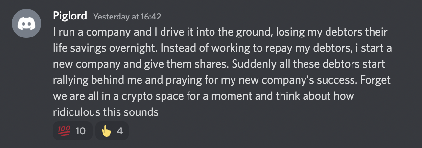You know what happens if you start a company and drive it into the ground? Bankruptcy. Your debtors are fucked. Then you start another company and own all the shares. This is total nonsense.https://twitter.com/FatManTerra/status/1530889290296737793 …