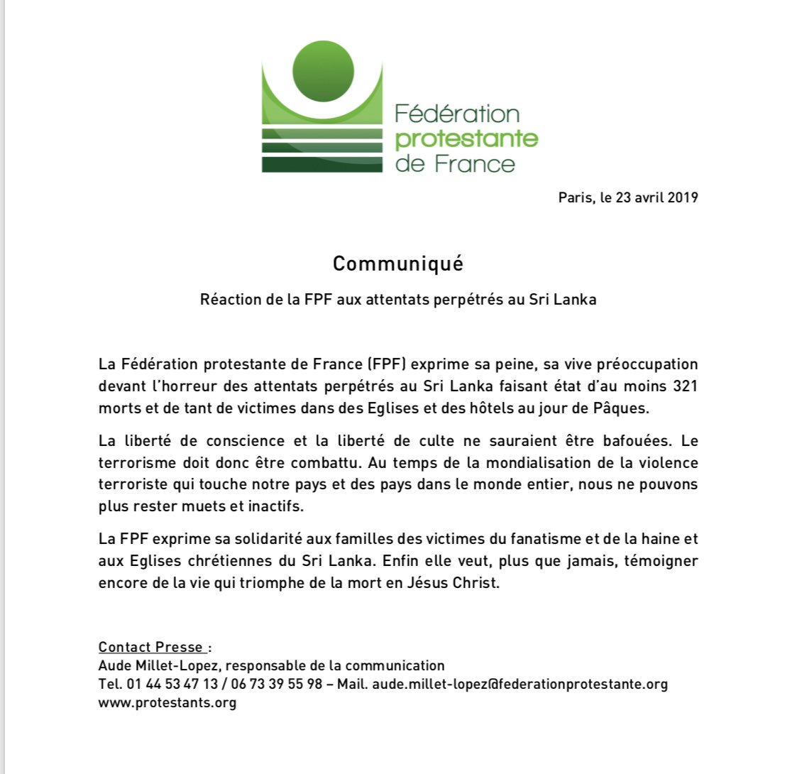 Communiqué de la Fédération protestante de France en réaction aux attentats perpétrés le dimanche de Pâques au Sri Lanka dans des Eglises et des hôtels faisant état à ce jour d’au moins 321 morts et de tant de blessés.