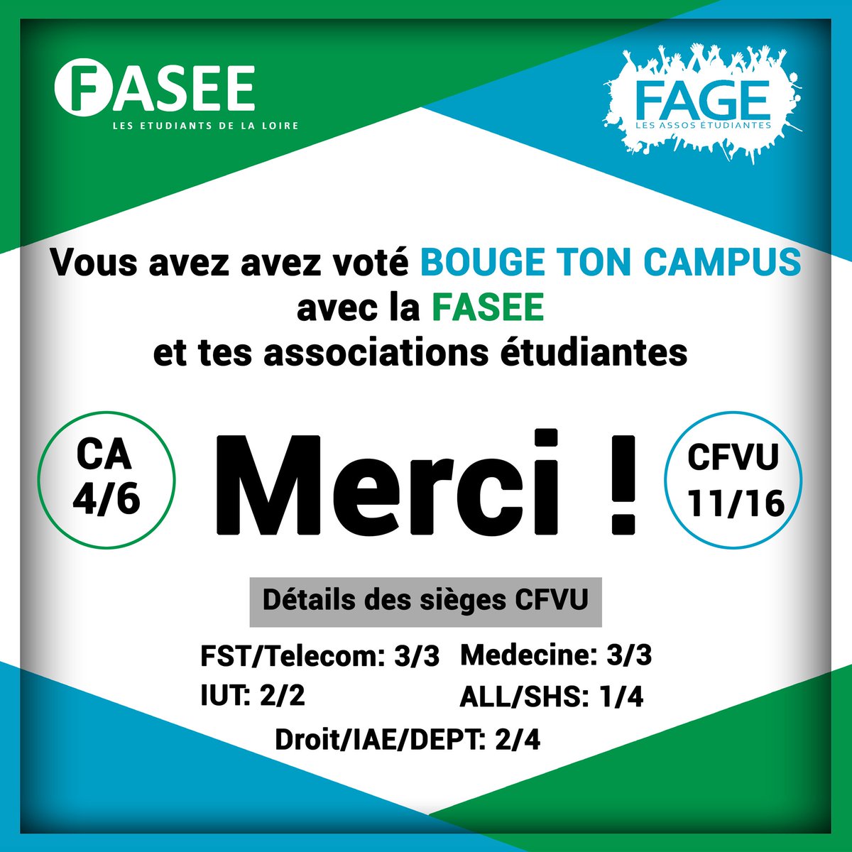 [ELECTIONS ETUDIANTES] Merci à toutes et à tous d'avoir soutenu la FASEE et les associations étudiantes lors des élections étudiantes du 17 octobre ! Votre mobilisation nous permet de rester majoritaire dans l'ensemble des conseils centraux de l'UJM Saint-Etienne. Merci !pic.twitter.com/sgwiDSBRMP