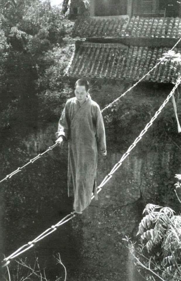 Monk walking on a chain bridge at the Yunjan Temple in China (c. 1930) over a 50m chasm