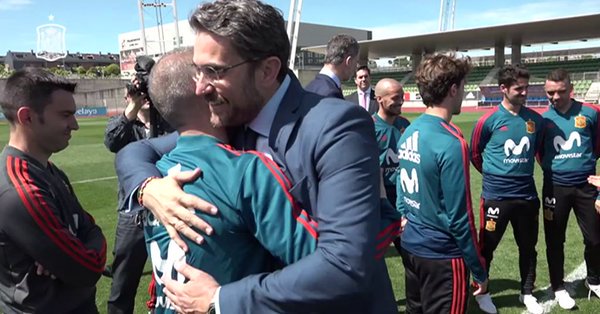 -Soy Máxim Huerta, Ministro de Deportes. Me han dicho que os vais al Mundial ¿tú cómo te llamas? -Iniesta, señor Ministro -Dame un abrazo, hijo, y a ver si te da más el sol y te comes unos chuletones -Sí, Sr. -Bueno, pues nada. Mucha suerte y meted muchas canastas ¿eh? -Vale.pic.twitter.com/mRDGYE7seC
