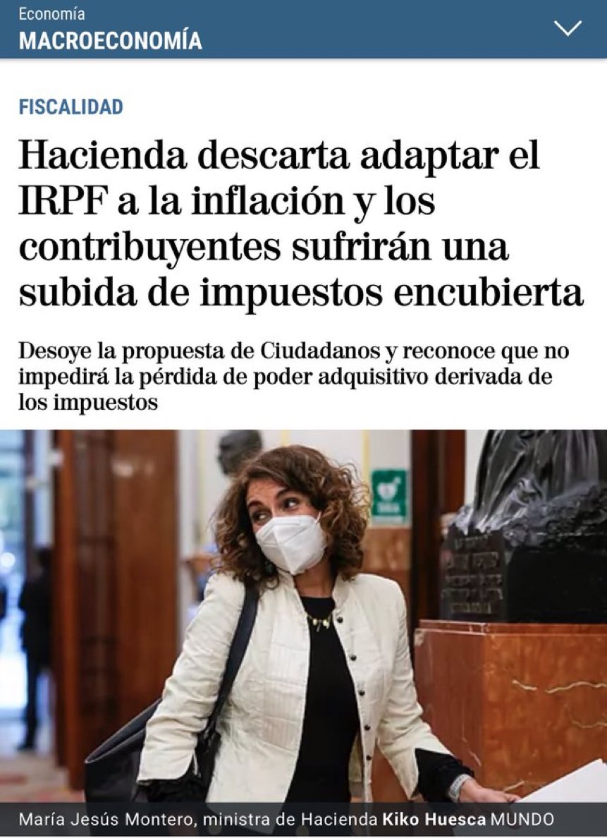 Actualizar los salarios con el IPC mantiene tu poder adquisitivo y no te hace más rico pero sí que Hacienda te cobre más impuestos. Pedimos que se adecue el IRPF para rebajar la carga fiscal de los hogares y ajustarla a su capacidad económica realhttps://www.elmundo.es/economia/macroeconomia/2022/02/11/6206317afc6c8398748b45a1.html …