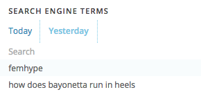 Search engine keywords used by new folks finding FemHype continue to be on point.