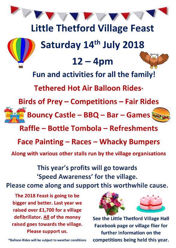 *WHAT'S ON* *TOMORROW* Little Thetford Feast Saturday 14th July 12-4pm Little Thetford Village Hall, Tethered Hot Air Balloon Rides, Birds of Prey, Competitions, Bouncy Castle, BBQ, Games and lots more!