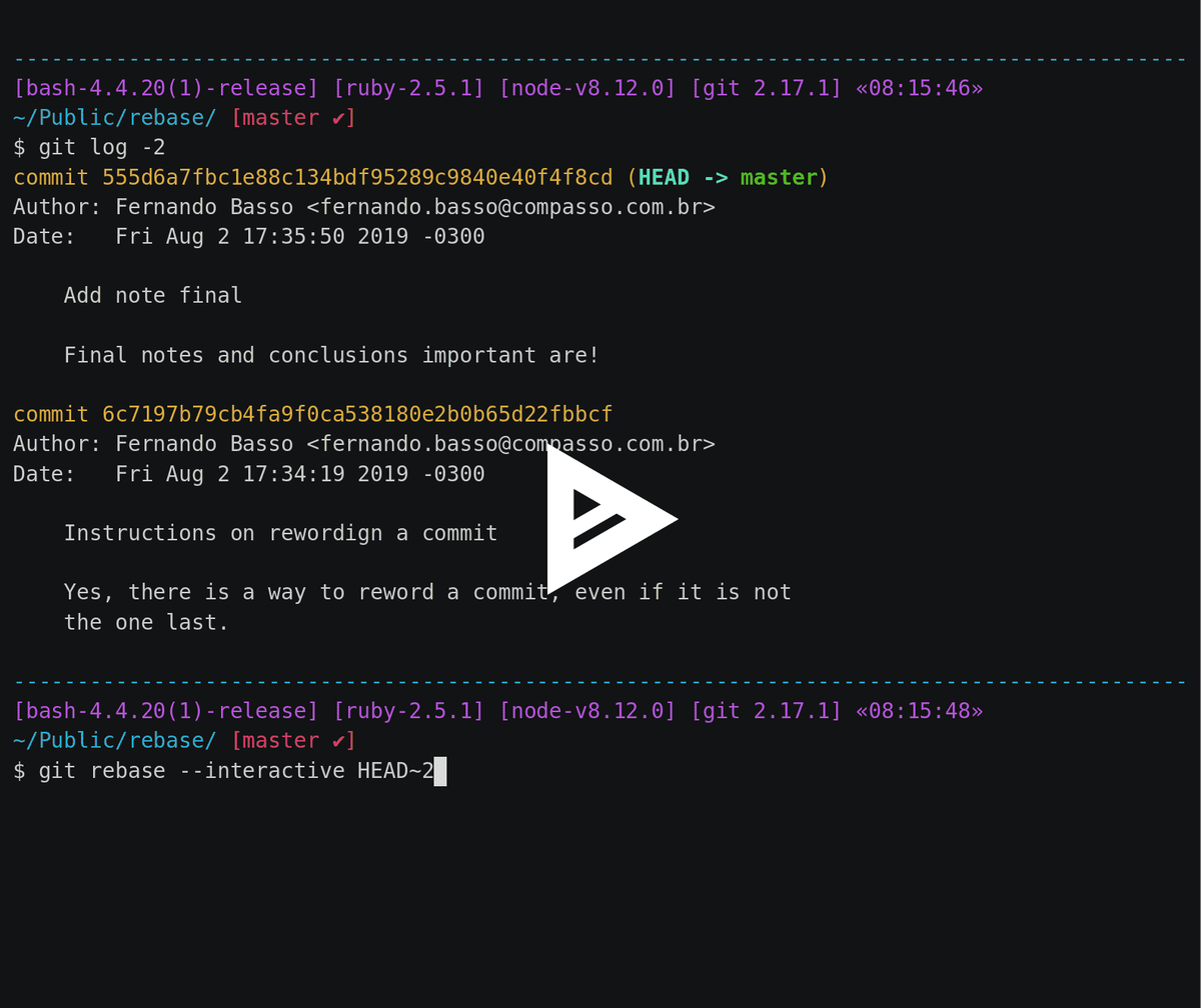 Git rebase is easy and useful for rewording commits! https://asciinema.org/a/260970 pic.twitter.com/MpR899dApw