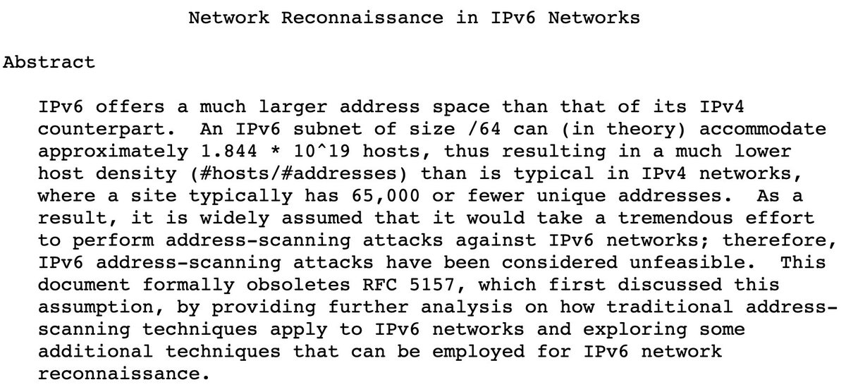 @FernandoGont et al. on performing recon in IPv6 networks: RFC 7707 Network Reconnaissance in IPv6 Networks https://www.rfc-editor.org/rfc/rfc7707.txt pic.twitter.com/oo59WpAK1j