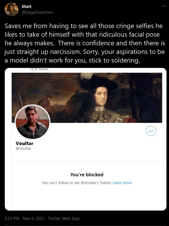 You went out of your way to check the timeline of someone you blocked, screenshot it, then tweet about it. You... kind of are, man. But OK.