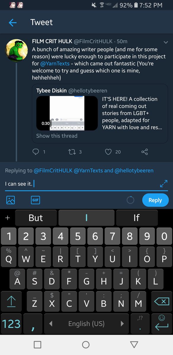 A bunch of amazing writer people (and me for some reason) were lucky enough to participate in this project for @YarnTexts - which came out fantastic (You're welcome to try and guess which one is mine, hehhehheh) https://twitter.com/hellotybeeren/status/1026904480317501440 …