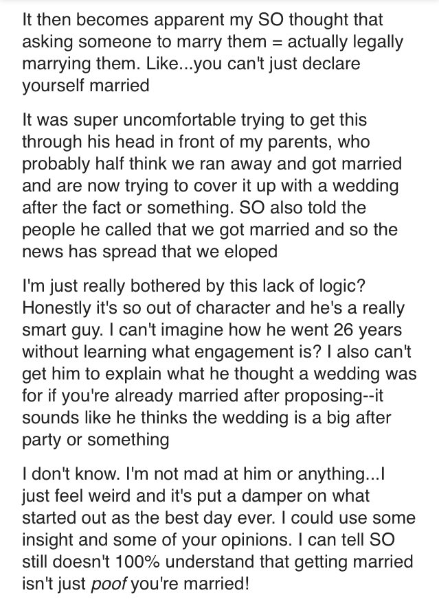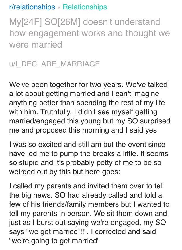 Thank god you’re all awake now so I can post this, my favourite r/relationships since shocktopus. https://www.reddit.com/r/relationships/comments/7xnx7e/my24f_so26m_doesnt_understand_how_engagement/ …pic.twitter.com/vKcKvWxxHK