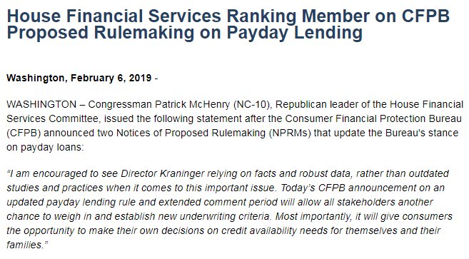 .@PatrickMcHenry: I'm encouraged to see @CFPB Director Kraninger: ✅Relying on facts & robust data ✅Allowing all stakeholders another chance to weigh in ✅Giving consumers the opportunity to make their own decisions on credit availability needs …https://republicans-financialservices.house.gov/news/documentsingle.aspx?DocumentID=404191 …pic.twitter.com/x3eN25zjJB