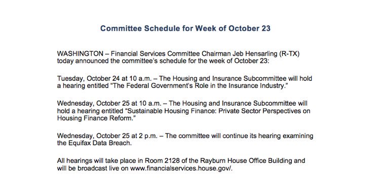 See our hearing schedule for this coming week below ↓ Watch all of our hearings at http://www.financialservices.house.gov pic.twitter.com/lhgDbrCCqH