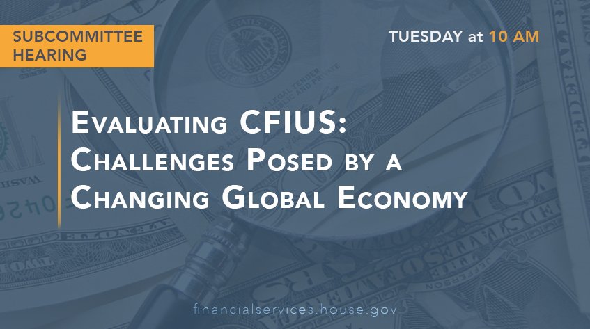 Two hearings tomorrow: @RepAndyBarr chairs a 10am ET hearing on CFIUS, and @RepBlainePress chairs our 2pm ET hearing on legislative proposals for a more efficient financial regulatory regime.pic.twitter.com/xMUuylD2re