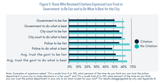 @IJ also found that ticketing residents in order to raise revenue harms perceptions of fairness and legitimacy in government. About 50% of people who were ticketed said they trusted police to "do what is best," vs 70% of those who weren't ticketed. https://ij.org/wp-content/uploads/2019/10/Taxation-by-Citation-FINAL-USE.pdf …pic.twitter.com/szXCxfwrBP