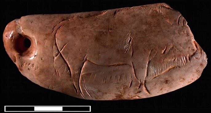 Around 13,400 years ago - during the last glacial period - a bison was carved on a sperm whale tooth in northern Spain. A hole was drilled in one end. This remarkable artwork was found in Las Caldas Cave