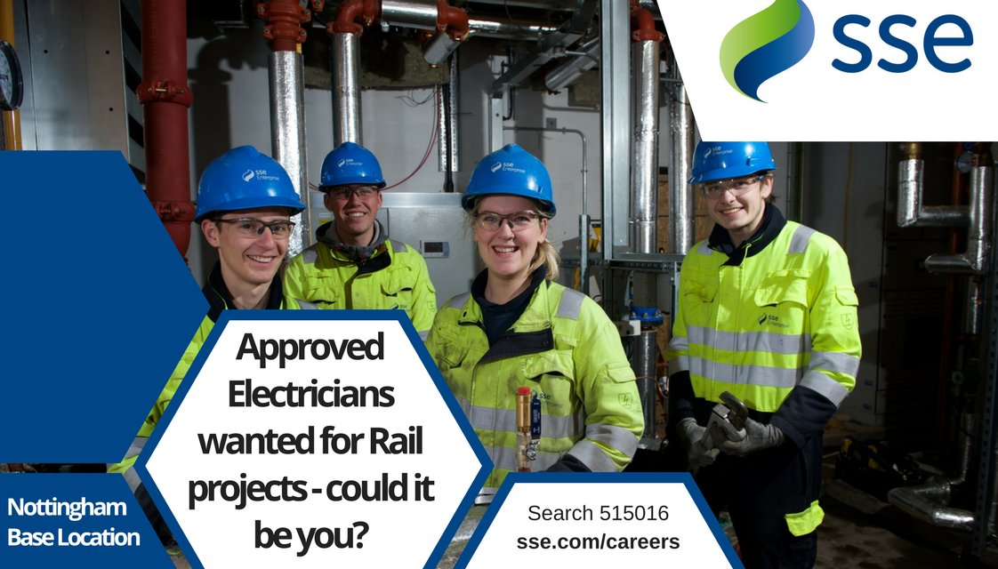 #Electricians wanted for Rail projects - could it be you? Base location#Nottinghamshire. Starting salary £29,171 plus excellent benefits. Search 515016 at http://sse.com/careers/ for more info & to applypic.twitter.com/SYlNhl4azd