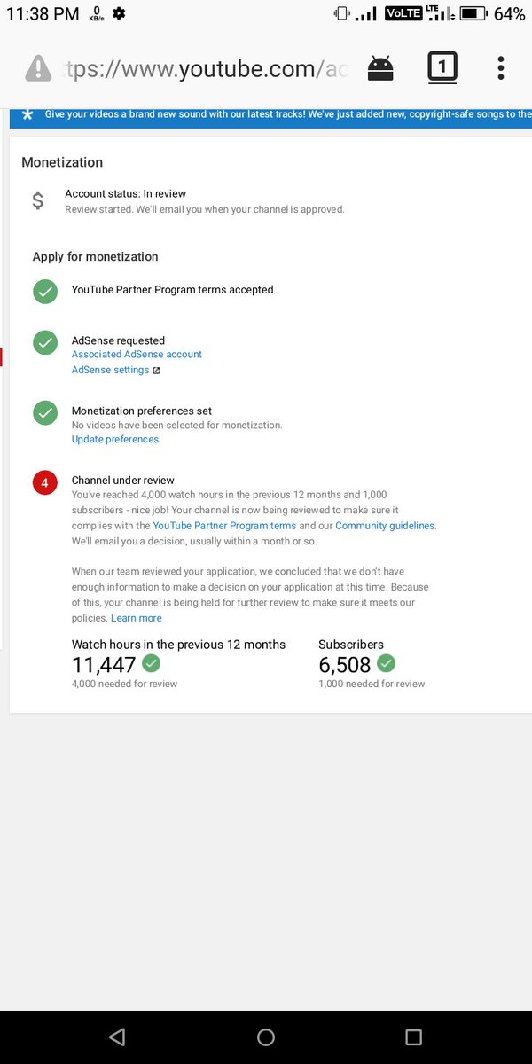 Hello team youtube i completed 4000 hour watch time and 1000 subscriber but my monetization not enable , please help me team youtube i request please i am waiting team youtube please help me . My channel link is :- http://www.youtube.com/SatguruTv  @TeamYouTube @YouTubeIndiapic.twitter.com/J6BYQBAkiA