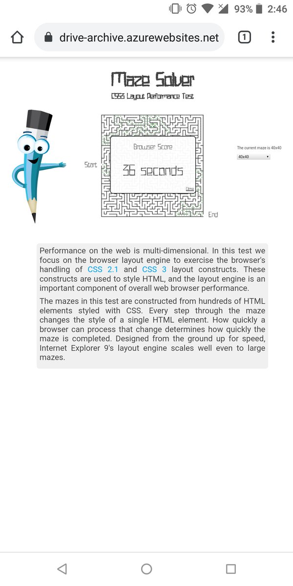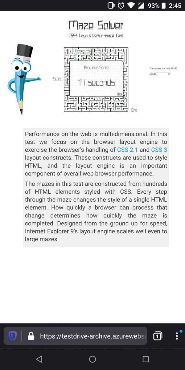 Got bored. Ran a benchmark on my phone. Preview Nightly finished twice as fast as Chromium. Test it on your phone! https://testdrive-archive.azurewebsites.net/Performance/MazeSolver/Default.html …pic.twitter.com/IkOgSTgzqn