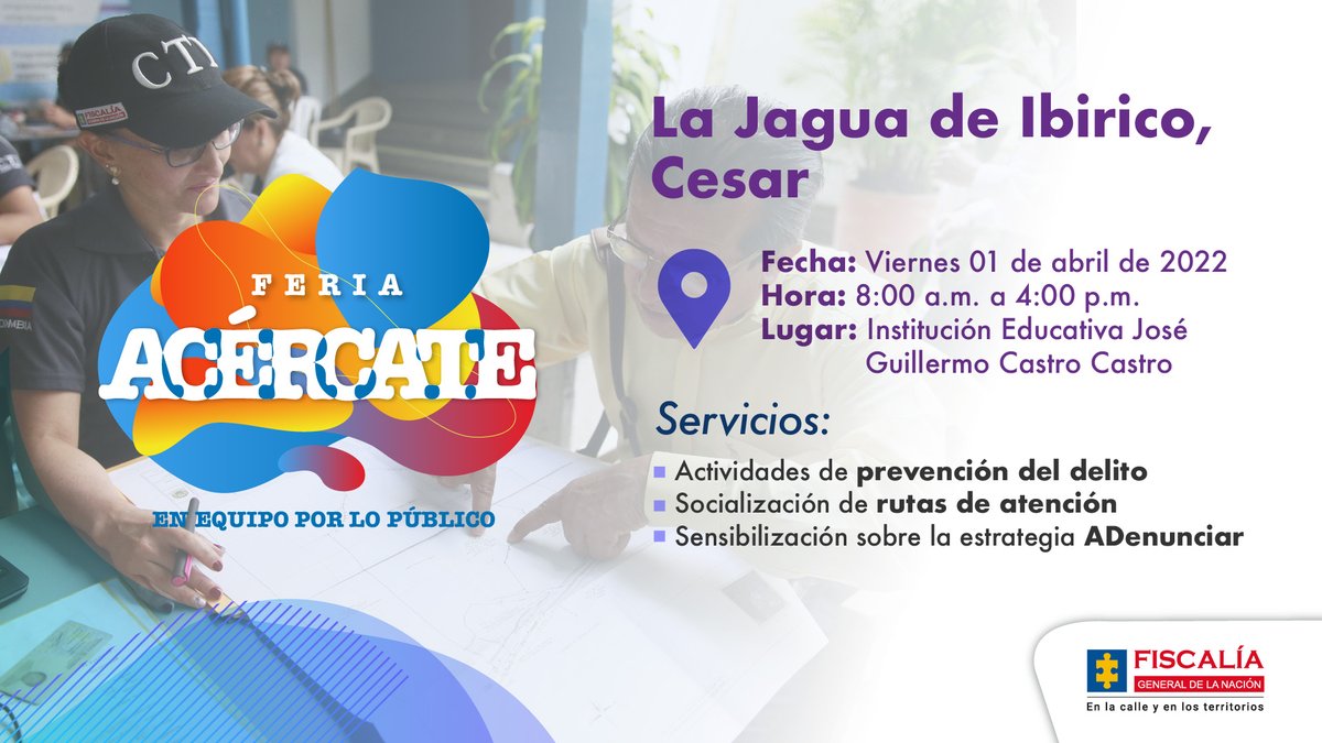 #Acércate, la#Fiscalía llega con su oferta institucional a La Jagua de Ibirico,#Cesar. Actividades de prevención del delito y socialización de las rutas de atención son algunos de los servicios disponibles. Viernes 1 de abril, a partir de las 8:00 a.m.pic.twitter.com/cDA75j87Hd