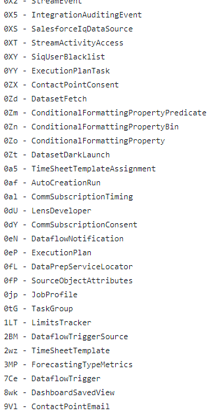 #Salesforce sObject keyprefixes in#Spring20. Some additional interesting finds: * ExecutionPlan * LimitsTracker * LimitSnapshot * DatasetDarkLaunch * Elt* * Dataflow* * MutingPermissionSet https://gist.github.com/FishOfPrey/fb4636e0df119d80f674b42155cd509d … https://twitter.com/FishOfPrey/status/1202311740425265152 …pic.twitter.com/WNqcmYLQRh