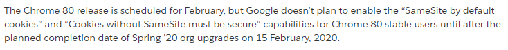 If you are concerned, do read the Salesforce knowledge article. https://help.salesforce.com/articleView?id=000351874&language=en_US&mode=1&type=1 … They do have this reassuring paragraph, but I'm not sure where they got the information about the delayed SameSite activation on the Chrome v80 release. It seems... very convenient.