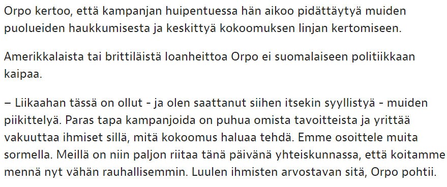 Orpo eilen Iltalehdessä: Paras tapa kampanjoida on puhua omista tavoitteista. Emme osoittele muita sormella, meillä on muutenkin niin paljon riitaa yhteiskunnassa. Orpo tänään Alman tentissä: Tämä punavihreä vastuuton himoverotuslinja tuhoaa Suomen!