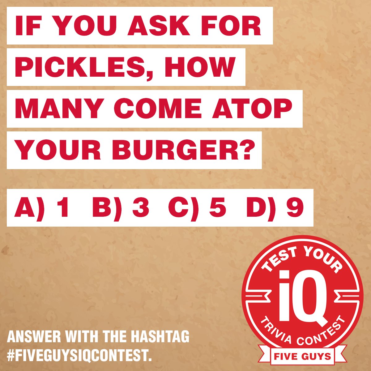 #FiveGuysIQContest and you could win a prize! *NO PURCH NEC. 50 US/DC, 18+. Ends 8/27/18. For rules, alternate methods of entry, hashtag, & all details, visit http://bit.ly/2n3IVHu . Void where prohib.pic.twitter.com/3MinIATk5C