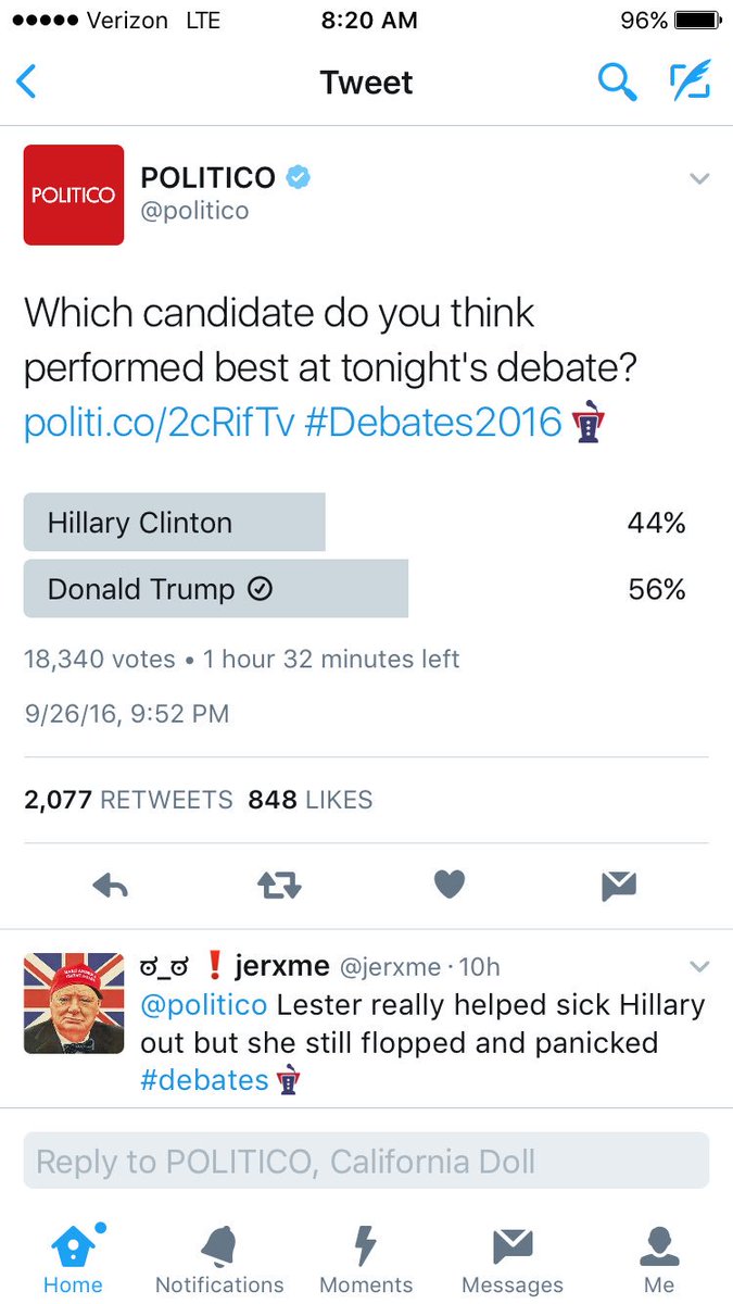 Check it out. She lost every poll except CNN. Thank god social media polls exist. Media is unreliable.