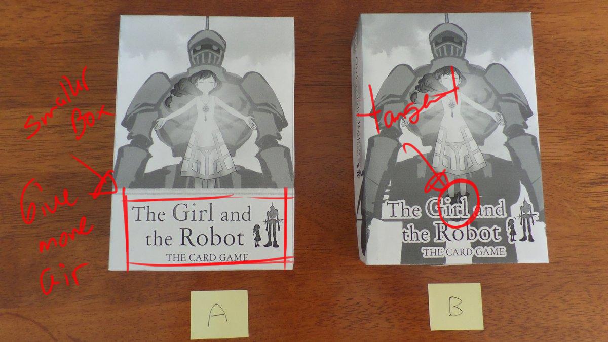 We're now prototyping the design of the box for our card game. Which one do you prefer, A or B?