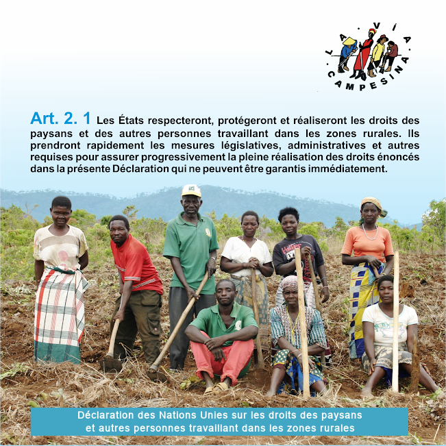 "Les États respecteront, protégeront et réaliseront les droits des paysans et des autres personnes travaillant dans les zones rurales." Article 2 de la déclaration des droits paysans