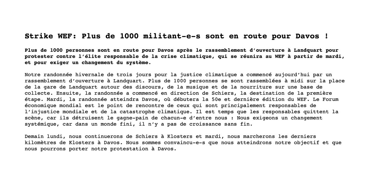 Communiqué de presse du 19.01.2020 16h00 Le Forum économique mondial réunit les principaux responsables de l'injustice mondiale et de la catastrophe climatique. Il est temps que les responsables quittent la scène! https://strike-wef.org/fr/strike-wef-ueber-1000-aktivistinnen-sind-unterwegs-nach-davos/ …