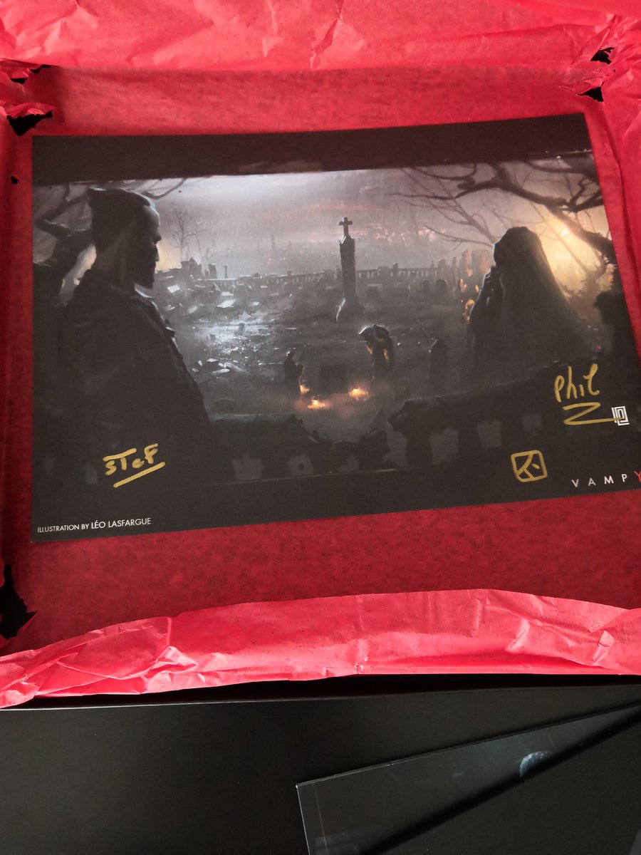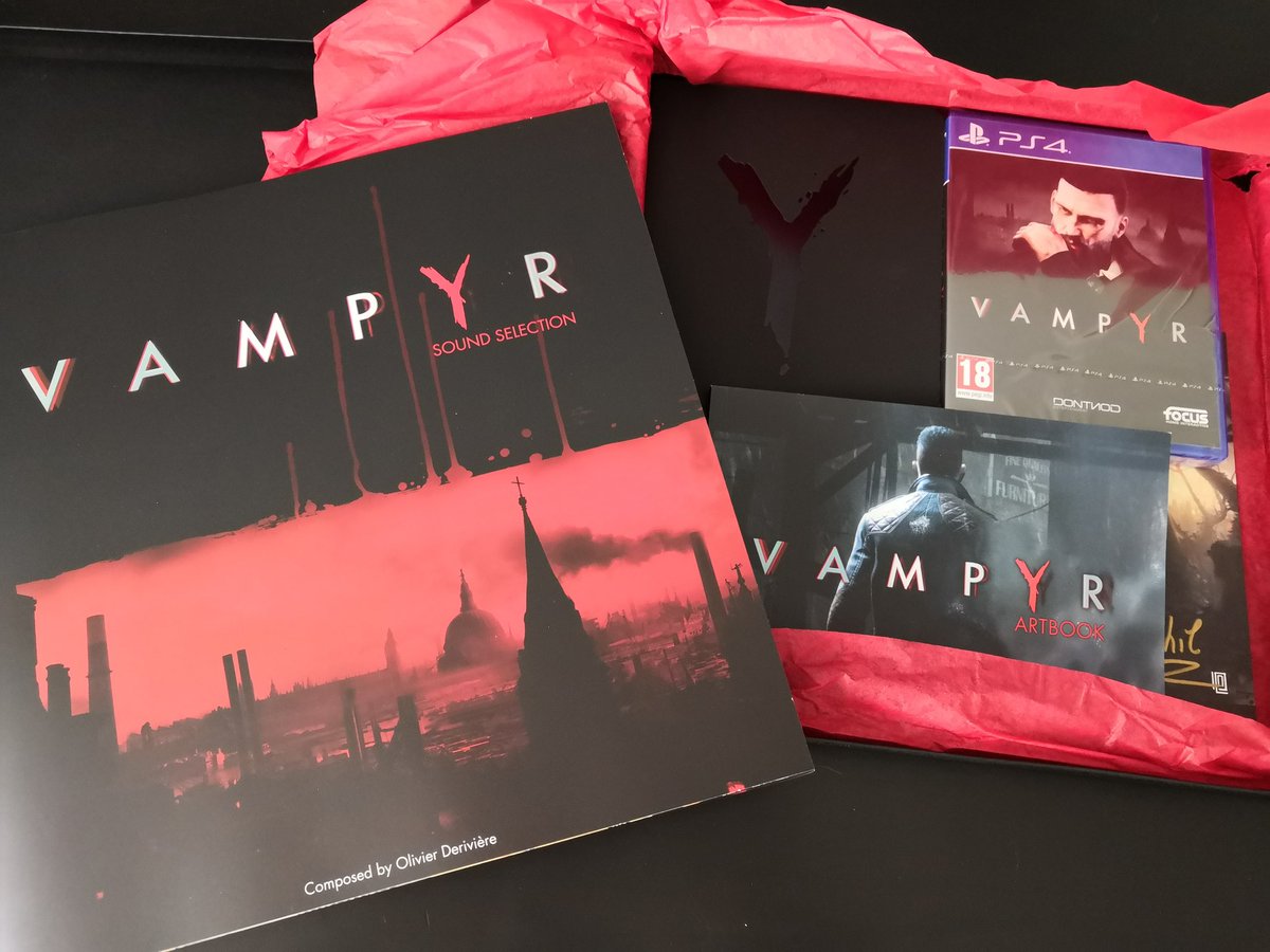 Très heureux de recevoir ce #presskit aux couleurs du jeu #Vampyr dispo le 5 juin. Vraiment un très beau press kit contenant le jeu, un dossier de presse, le vinyle, la BO en demat, un artbook, un carnet et surtout un artwork dédicacé par une partie de l'équipe du jeu 👌 pic.twitter.com/XZE36doL62