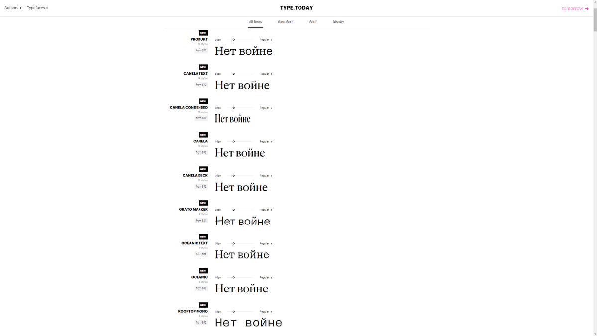 Russian type foundry http://Type.today has come out with a statement against the current Russian incursion into Ukraine. The sample text used on their site's store has also been changed to read "Нет войне", Russian for "No to war". https://twitter.com/TypeTodayNews/status/1497914206821232643 …pic.twitter.com/MgYALkFw0V
