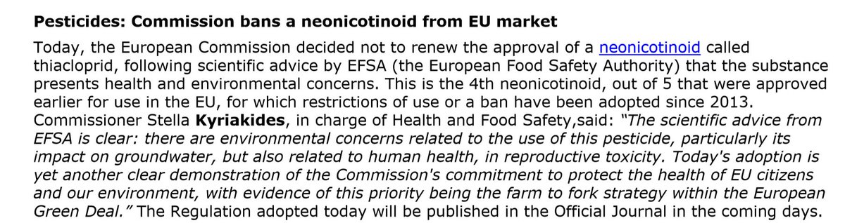 #EFSA scientific advice on thiacloprid is clear: there are concerns about the impact on the environment, groundwater & human health. Today’s@EU_Commission decision to ban its use shows our commitment to protect the health of EU citizens & our environment.#Farm2Fork#EUGreenDealpic.twitter.com/aXRk5Nc2gr