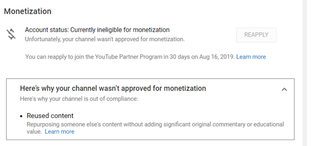 @YouTube @YTCreators YT - 1 Month application for monetisation. YT took 7 months to reject me YT Say - You've been rejected for reused content. 26 active videos. 15 don't feature other content. Rest do under fair use with commentary. Now I have to wait another 8 months?!pic.twitter.com/jhE4CRYprs