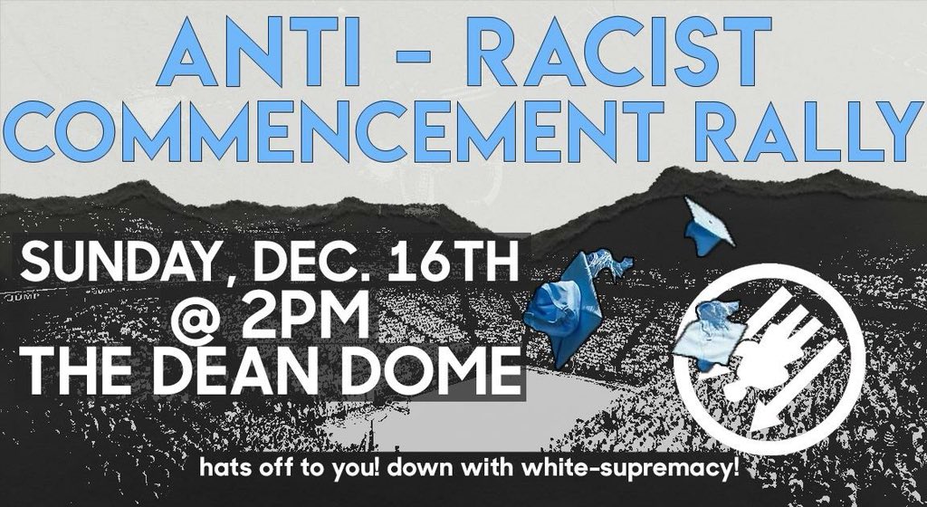 This actually is occurring during the winter convocation, and students aren’t happy about it. Many with student group @strikedownsam #strikedownsam plan to counter with an “Anti-racist commencement rally.”pic.twitter.com/CRArZorRse