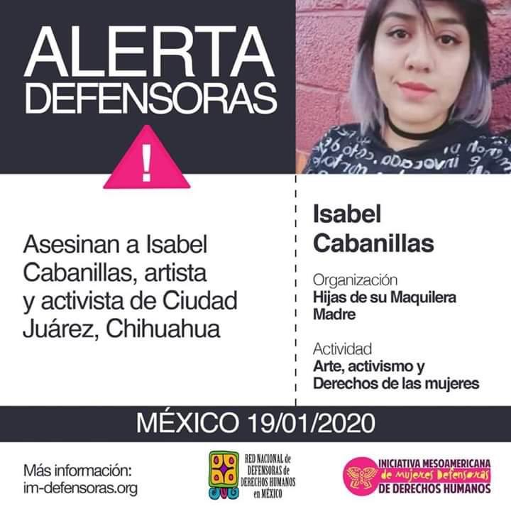 @CIDH lamenta profundamente el feminicidio de la defensora de#DDHH y artista plástica Isabel Cabanillas, el pasado 18 de enero en Ciudad de Juárez,#México. La@CIDH expresa su solidaridad con sus familiares y seres queridos 1/4.pic.twitter.com/cjwLASa2II