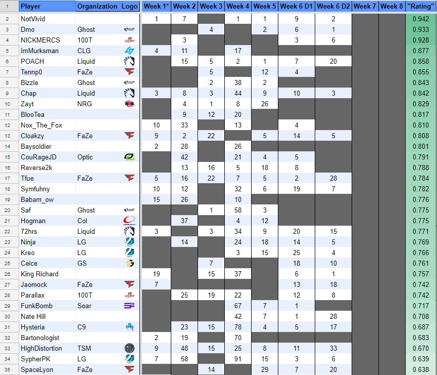 Average Summer Skirmish placements in North America. 1. @VividFN 2. @zzdmo 3. @NICKMERCS Check out the full list! https://docs.google.com/spreadsheets/d/1_rRxvM2AMkfR-nU3de5Qz0_zi-1feppz03o6vmscSLM/edit?usp=sharing … #Fortnite #esportspic.twitter.com/hjIX8GeKaj