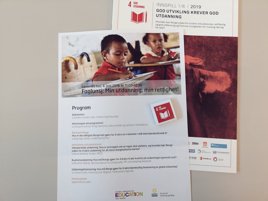 Straks klart for faglunsj om Norges innsats for #bærekraftsmål4! Les vårt fellesinnspill her (pdf): http://www.forumfor.no/assets/docs/FORUM_brief_Utdanning-web-endelig-versjon.pdf …pic.twitter.com/DHJzQYNrMo