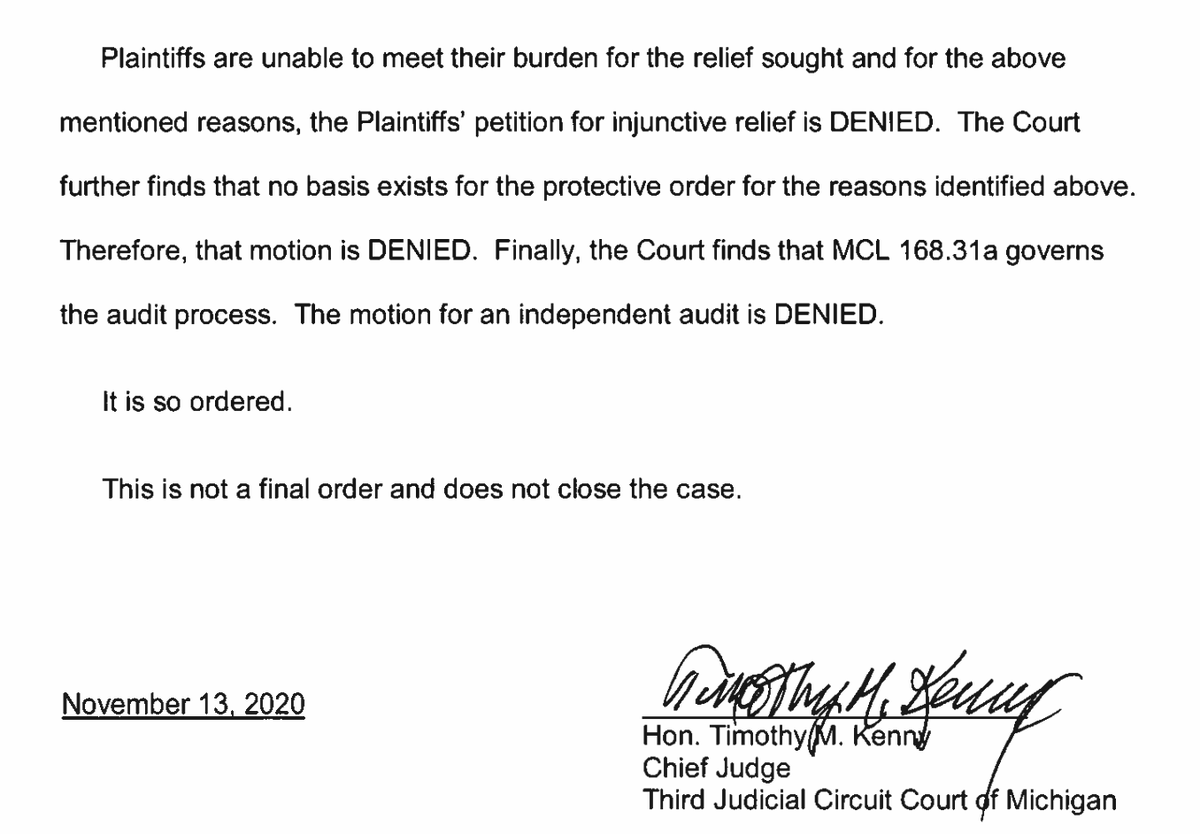 BREAKING and DEVELOPING: Michigan Judge Denies Injunction, Setting Aside Trump Supporters' Conspiracy Theories About Detroit https://lawandcrime.com/2020-election/michigan-judge-puts-the-kibosh-on-trump-supporters-conspiracy-theories-about-detroit/ …… via @lawcrimenewshttps://twitter.com/KlasfeldReports/status/1327315409943531533 …