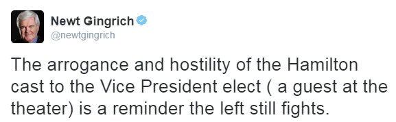 @FoxNews@newtgingrich@mike_pence Hamilton's cast welcomed Pence asked for tolerance and protection from bigotry. Trump says harassment - 1 more reply