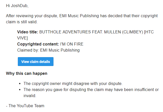 @emimusic Why are you guys harassing me? I've had multiple videos claimed and disputes rejected even though the videos clearly have no hint of the song "I'm on fire" I literally have no leg to stand on with this @TeamYouTube - do i just give them all my ad revenue?pic.twitter.com/keZsUHig3H
