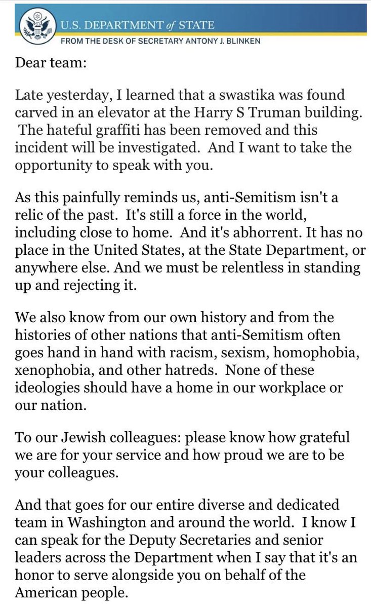 BREAKING: Secretary Blinken to staff on swastika incident: This reminds us antisemitism is not a relic of the past. It has no place in the U.S., at the state department or anywhere else. To our Jewish colleagues please knkw how grateful we are for your service pic.twitter.com/aOuzVCxaoX