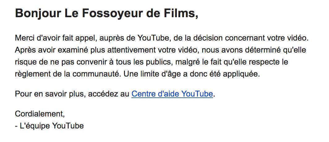 Ok, donc il y a une semaine, je reçois un mail de Youtube me disant que le Top 10 des pires clichés est soumis à une restriction d'âge. Ça n'a aucun sens, puisque c'est une vidéo ultra inoffensive, sans nudité ni violence ni sujets "sensibles". Mais soit. Un bug, peut-être.pic.twitter.com/jDCiBBdwRf