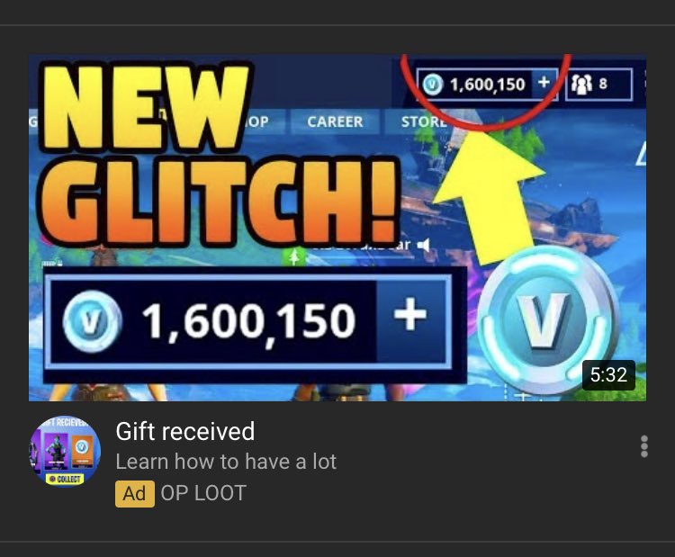 @FortniteGame @TeamYouTube can I stop seeing this Ad everywhere? It’s clearly clickbait and it’s just annoying seeing it on my feedpic.twitter.com/3olBiJDPHf