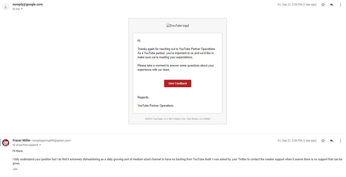 SO this is the email corrospondance I have gotten which is completely and utterly useless and shows that YouTube really doesn't care. And highlights some very concerning things when it comes to YouTube as a whole. They also asked for feedback... which I found to be pretty cheekypic.twitter.com/Gags2iC4ez