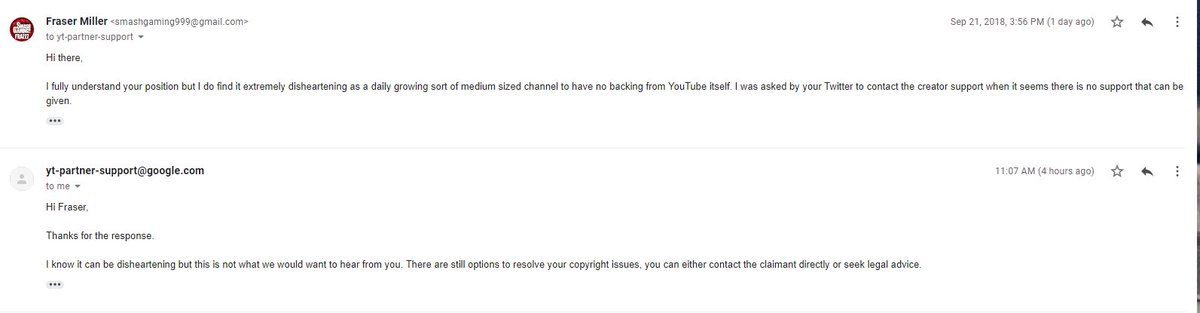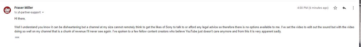 the sheer lack of help on YouTube's side with extremely copy and paste answers. I am no where near the biggest of channels on YT obviously but their advice is to "contact Sony or seek legal advice". This all steeming from a sound in a video that was part of the game [cont]pic.twitter.com/kfJNlsTtzQ