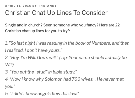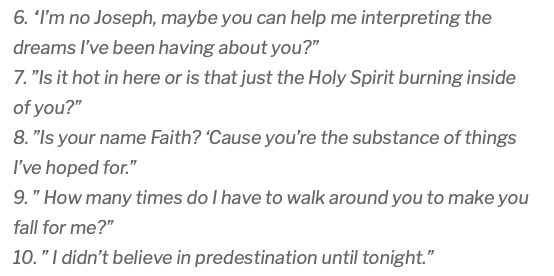 I just stumbled across a list of Christian chat up lines and OH. MY. GODpic.twitter.com/0wUTHyPrUF